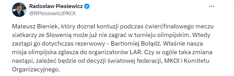 Mateusz Bieniek, podstawowy zawodnik kadry, najprawdopodobniej nie zagra już na igrzyskach. Ma zastąpić go pochodzący z Krzyża Wlkp. Bartłomiej Bołądź, który do Paryża pojechał jako trzynasty, rezerwowy zawodnik.