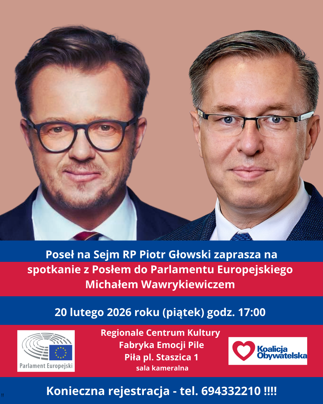 W piątek, 20 lutego, w Sali Kameralnej w Regionalnym Centrum Kultury w Pile, odbędzie się spotkanie otwarte z Michałem Wawrykiewiczem, posłem do Parlamentu Europejskiego.