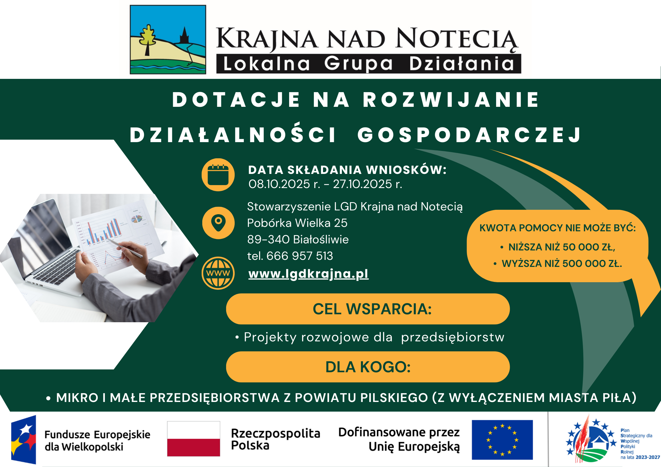 Nabór wniosków prowadzi Stowarzyszenie Lokalna Grupa Działania Krajna nad Notecią, które otrzymało środki rozwojowe z funduszy europejskich, w ramach Planu Strategicznego dla Wspólnej Polityki Rolnej. Szczegóły można uzyskać w biurze LGD, pod numerem telefonu 666 957 513 lub poprzez stronę www.lgdkrajna.pl.
