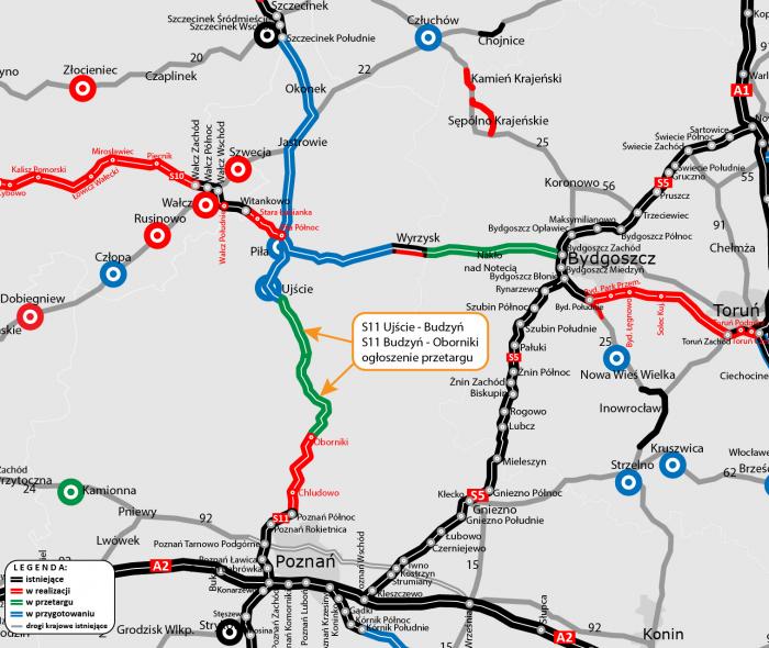 Budowa kolejnego odcinka S11 na północy Wielkopolski staje się faktem. W czwartek ruszył przetarg na budowę 43-kilometrowego odcinka Ujście-Oborniki. Inwestycja będzie podzielona na dwa etapy: Ujście-Budzyń i Budzyń-Parkowo, gdzie będzie się łączyć z odcinkiem Oborniki-Poznań, którego budowa ma ruszyć w przyszłym roku.